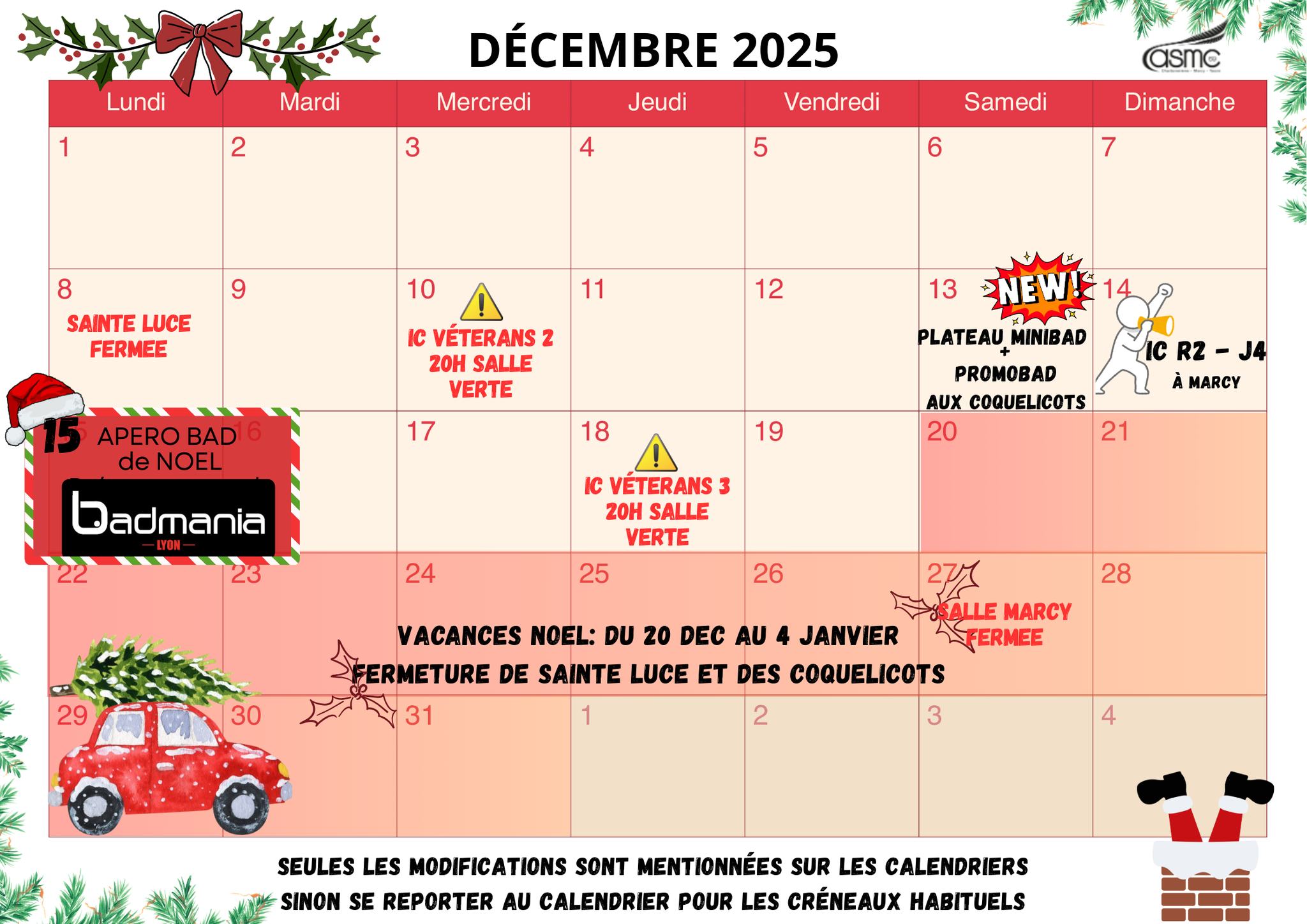 - des fermetures de gymnase ou des créneaux indisponibles, pour cause d’Interclub, de 08 décembre, de vacances scolaires.