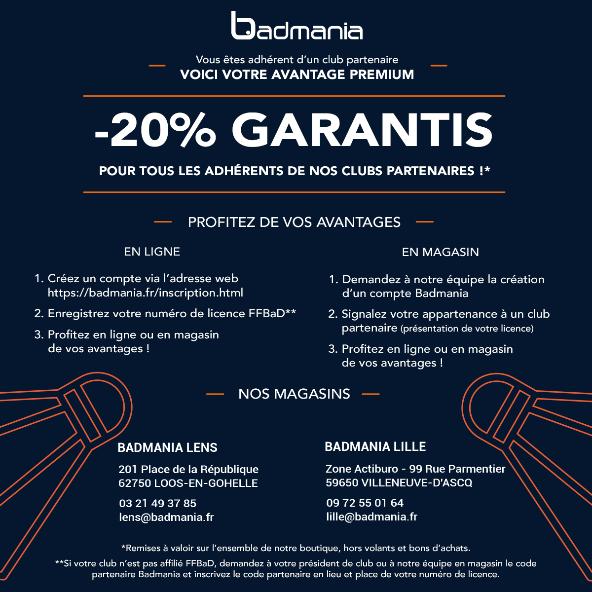Créez votre compte joueur sur Badmania et profitez d’une remise club de 20% sur le prix public pour tous vos achats sur le site hors balles et volants. Pas d’inquiétude pour l’achat des volants, ça se passe ici : ACHAT VOLANTS ASMC Badminton