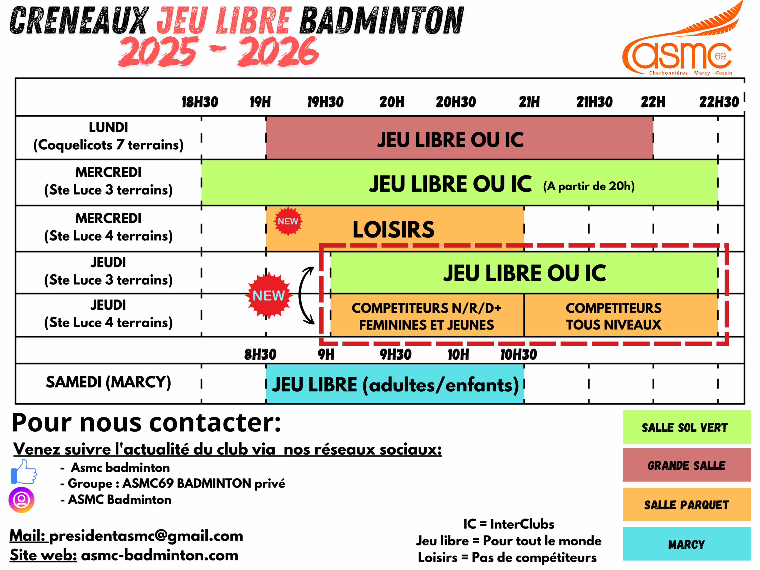 Toutes les informations concernant les créneaux d’entraînement et de jeu libre sont disponibles ci-dessous :